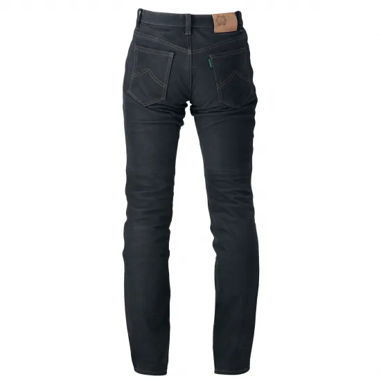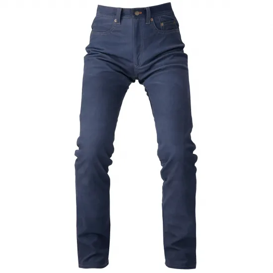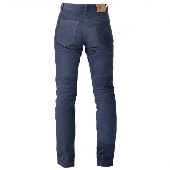 ブルージーンズ仕立ての画期的なレザーパンツ。北米産のステアに特殊加工を施し、デニムの持つ独特の風合いに仕上げました。シルエットは誰にでもフィットする飽きのこない定番のストレートタイプとなっています。牛革にフッ素加工を施すことにより、優れた撥水効果を確保。レザーでありながら日常のメンテナンスも容易で、自宅での丸洗い洗濯が可能です。 膝に別売りのKフォームプロテクターを装着できます。外観はナチュラルなままプロテクション性をプラスできます。
